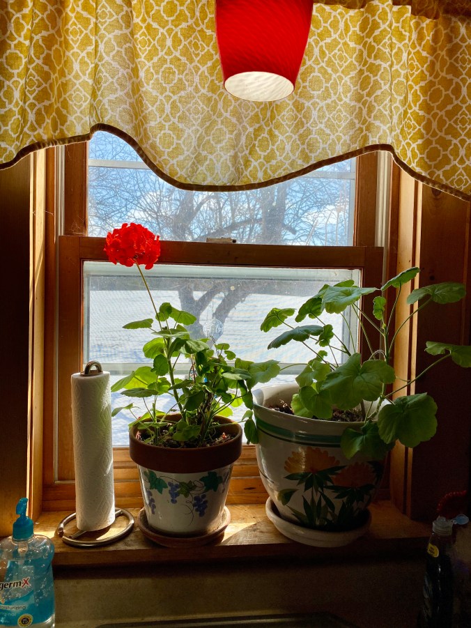 I gathered my remaining plants. The geraniums I winter each year in my classroom. I grabbed several on our last day – not sure what the coming days would hold. When I returned today I didn’t expect any signs of life, but green still resided in a few of the pots. With some TLC a couple of them will recover.