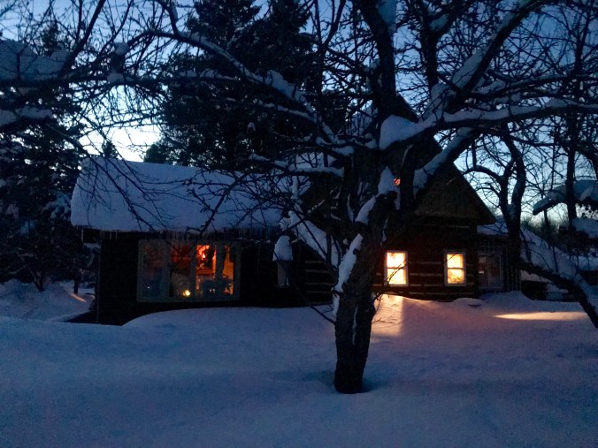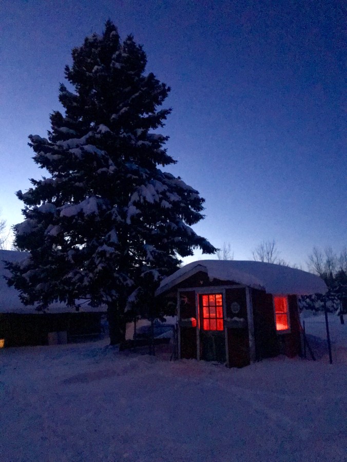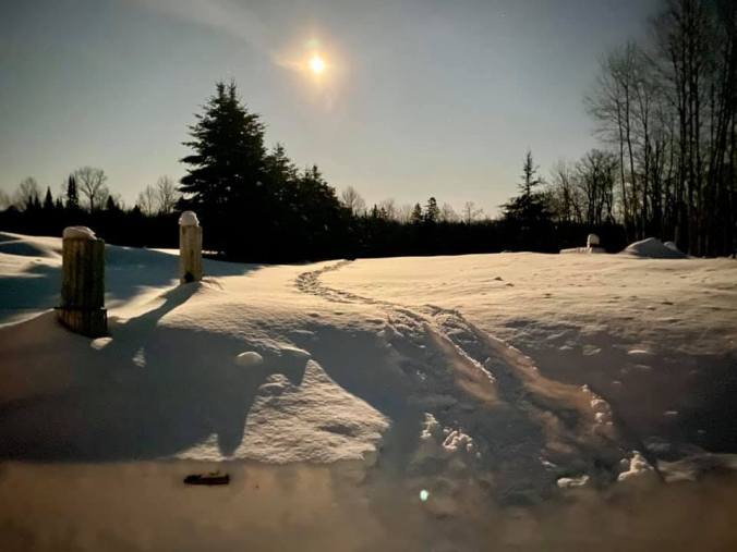 As a writer I have what I call my, “Monet Moments”.  When I want to experience the world with a new lens. Mid-February I was watching the blues set in at night (on many levels). I wanted to snowshoe at dusk to experience the optical effects of light up close and personal and not just from the mudroom window. I have a trail carved around our pasture and approximately three and a half times around is a mile.