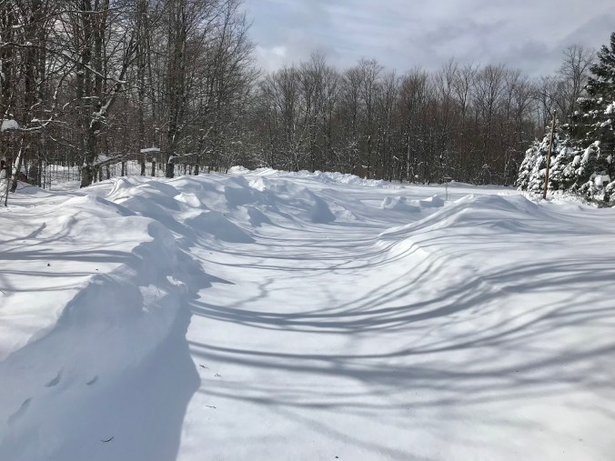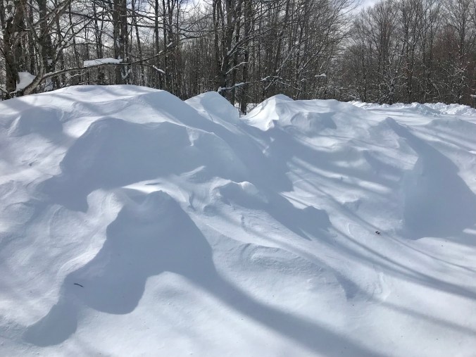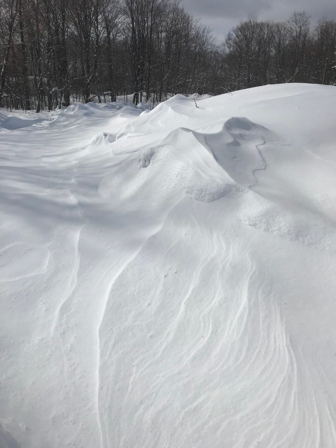 When I strap my snowshoes on to burn hundreds of calories, I am also tuning in, memorizing, and categorizing colors, sounds, shapes, fragrances, and textures. It’s true, I even snowshoe with the sensibility of a writer. While I am trudging through the snow I am keeping a deft eye on the landscape, and even though I usually stick to the same path, every day the scenery is different. The snow is never the same shade of white and even the snowbanks are malleable and are shaped by the elements. One day they are choppy from plowing and the next day the peaks are smoothed by the wind like a piece of Lake Superior beach glass tossed by the waves. One day the snow is a flawless, glistening sheet and the next day the  surface of the snow wears sparkling grooves and flowing ripples.